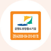 강원도에 위치한 제조기업을 대상으로 기술력이 우수하고 성장력이 높은 기업에게 [강원도 유망중소기업]으로 인증합니다. '매출 성장, 기업의 신용평가, 기술품질수준, 기술혁신 노력, 일자리 고용 창출' 등 총 70여가지의 항목을 대상으로 각 분야 전문가의 엄정한 평가를 통해 강원도 유망중소기업으로 인증됩니다. 강원도 유망중소기업으로서 으뜸 청정도시 강원의 토박이가 가족과 고향을 지킨다는 순수한 마음으로 정직한 기업을 만들고 고객님들과 함께한 결과 대형마트, 홈쇼핑, 백화점 등 다양한 판매 채널과 해외 수출의 판로를 확대하고 있습니다.